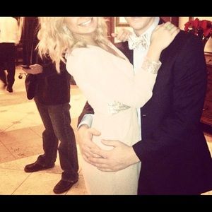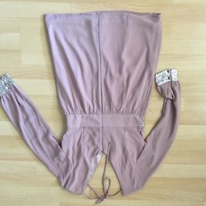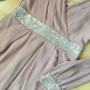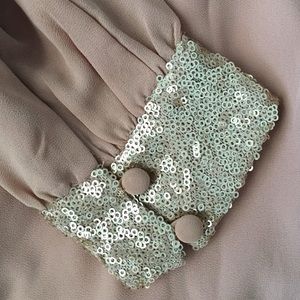 Mauve color with gold sequined details on the cuffs and around the front waist of the dress. Ties and zips in the back. VERY comfortable. ONLY worn ONCE! 🍾