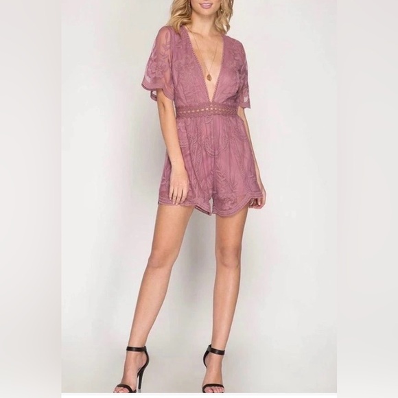 Lace mauve romper by Honey Punch. Sheer flutter sleeves. Flattering V deep V neckline. Embroidered lace, back zipper.