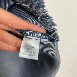 maven west frayed denim tank, fringe hem blouse, tencel summer top, sleeveless denim blouse, relaxed fit tank, made in usa clothing, casual denim top, layering blouse, boho fringe hem, everyday essential