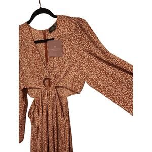 Maverick The Collection Cutout Floral Maxi Dress – Size L – NWT with tags! This beautiful floral maxi dress from Maverick The Collection features a rich rust color with an all-over ivory ditsy floral print. Designed with long balloon sleeves, a flattering gathered waistline, and stylish cutout details at the front and back, this dress is both comfortable and eye-catchingPerfect for brunch, baby showers, fall weddings, or everyday boho-inspired elegance.