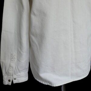 Destressed collar, snap closure, front flap pockets with snaps. Snaps are silver, long sleeved with snaps at wrist. Color is white with faint light grey stitching. Lovely longer style shacket jacket. 100% cotton white denim, machine wash gentle cycle, hang dry or tumble dry low, iron if needed. Item arrives clean with no damage as it was barely worn.