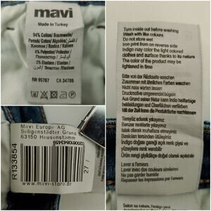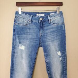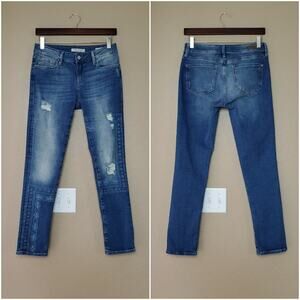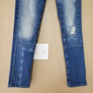 Mavi Jeans Co. Angie slim straight distressed printed denim jeans, size 27. Stretchy. Mid-rise. Light print on the front. Pants zip and have a button fly closure.