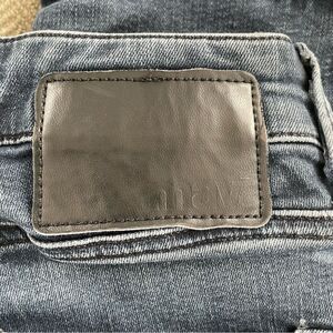 Men’s Mattie, straight leg, blue jeans with black brand patch on the back waist. Cotton and elastin blend. Measurements are approximate and taken while laying flat: 16.5 inches straight across the waist with a 10 inch rise and a 31 inch inseam. Please note the tax size is 34 x 32, however these measure at a 31 inch inseam..