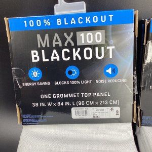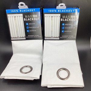 Set of two white 100% blackout Max 100 Blackout 38"Wx84"H white curtain panels. The curtain panels are energy saving, blocks 100% light, and noise reducing. They have grommets along the top for hanging. No stains or holes. See photos for packaging, condition and packaging information.