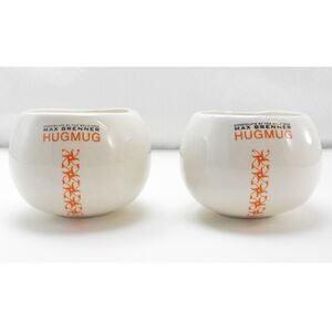 Set of two Max Brenner Hug Mugs. Ivory with orange design and wording: Chocolate by the Bald Man Max Brenner HugMug. The bottom reads the same, and Made in China. Cup measures approximately 4-1/4" long with a 3-3/4" top opening, and is 2-5/8" high.