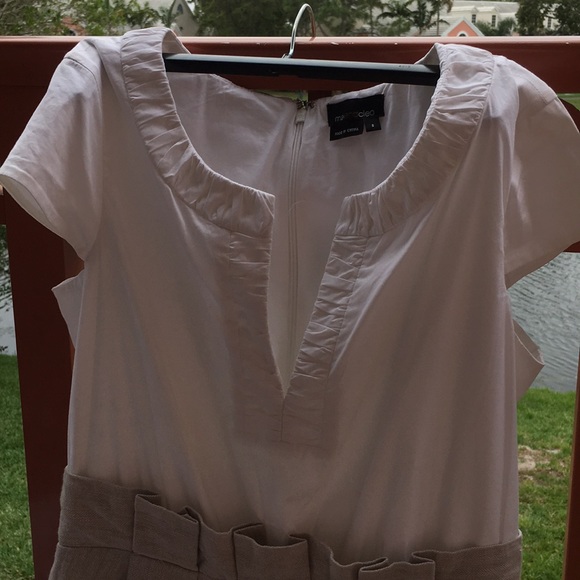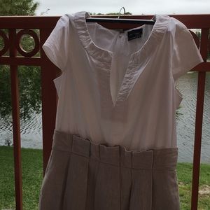 Chic dress by with crisp white cotton top attached to cream colored high waisted linen bottom.
