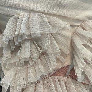 Max & Cleo dress with mesh overlay. Rouching on the sides makes it super flattering! Rosette detail on the bottom.