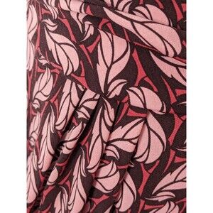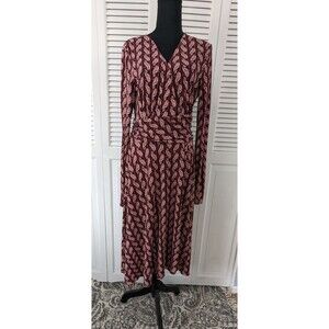Max & Cleo Dress Womens sz M Pink Brown Leaf Print Faux Wrap Stretch Fit Flare