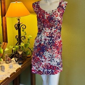 Chic mini dress with abstract pattern. Features vibrant red, purple, and white hues. Perfect for stylish outings. This dress is true to size and the zipper is on the back. Fairly used and in great condition! Open to offers