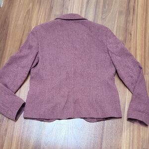 Elegant mauve blazer with button front. Features charming ruffle pockets. Ideal for any occasion.fully lined. excellent pre-owned condition