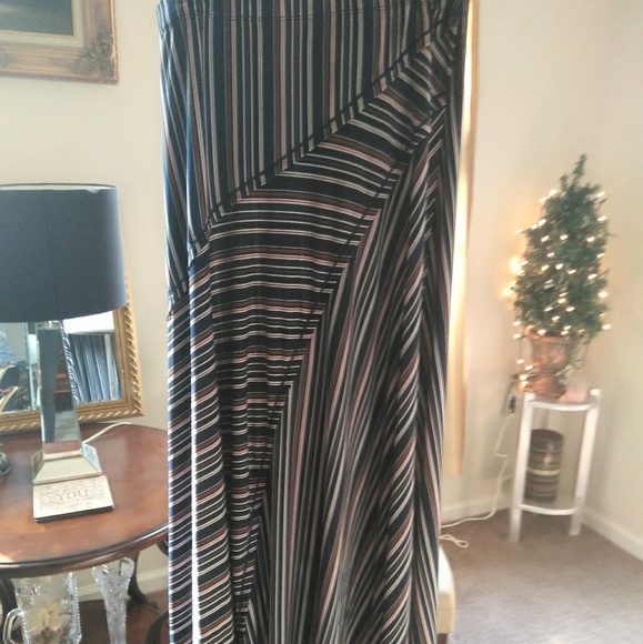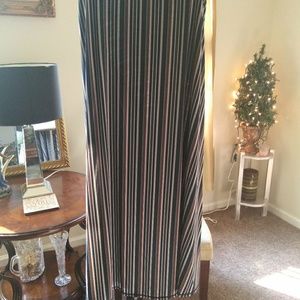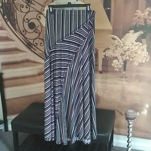 41" inches long stripped skirt. 95% polyester 5% spandex. Made in China. Machine wash cold with light colors delicate cycle, do not bleach lay flat to dry who iron if necessary.