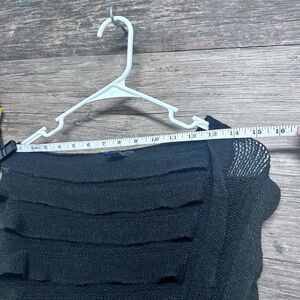 Stylish black poncho with fringe detailing. Features a layered design. Perfect for layering.
