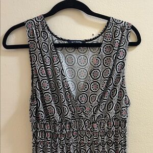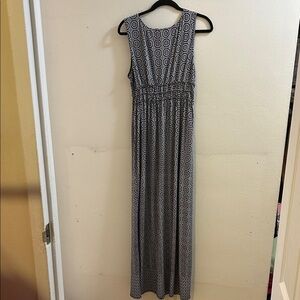Chic maxi dress with a striking geometric pattern. Sleeveless design for versatile wear. Ideal for both casual and formal settings.
