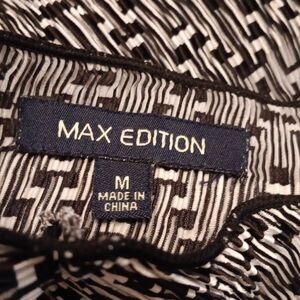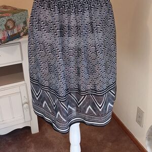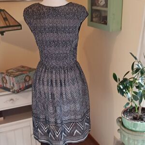 Tiny crimping guarantees a perfect fit on the bodice of this dress. Semi-full skirt. Interesting geometric design in black and white. Bolder border print. Cap sleeves, pull over. Unlined. No content tag, but Im sure this is a woven poly. Size M measures 36-44 at chest, 34- 42 at waist, 50 af hips. 38 long from shoulder to hem. Very comfortable.
