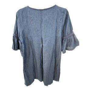 Light denim or chambray dress from the brand MAX EDITION. The dress features a V-neckline with braided trim details and half-length bell sleeves. Really cute light summer dress.