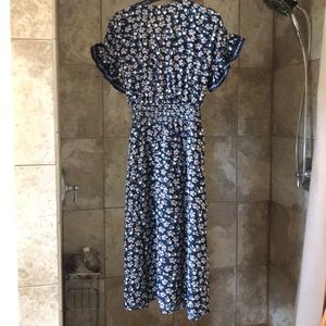 Navy blue poly dress with frilly sleeves and smocked waist in the back. Front-tie. Pretty and lightweight. Women’s size 4. Brand new with tags. Midi length. Hand wash, hang-dry.