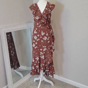 Max Edition Brown Floral Ruffle Wrap Midi Dress Size S