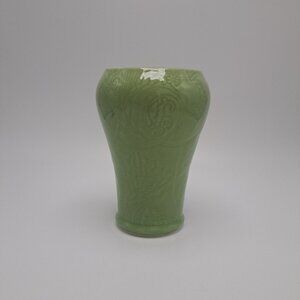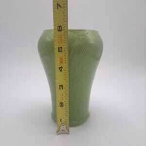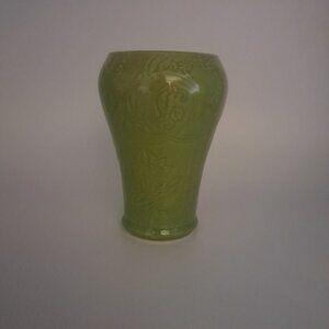 This green embossed ceramic vase, once part of the Khara Fantasy Milk Bath collection, adds an elegant touch to home decor.