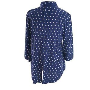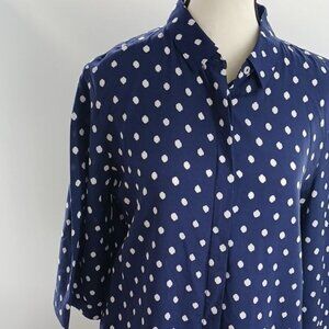 Max Jeans Button Down Blouse Womens Size S Navy Blue Polka Dot 3/4 Sleeve Light