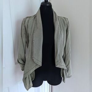 Women's small soft Tencell drape jacket by Max Jeans. Small but barely noticable various stains on the collar, sleeve, and corner, (see pictures) Waist drawstring in the back, but no real stretch in the jacket itself