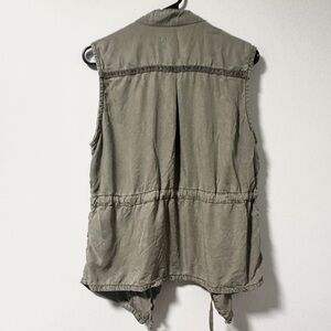 Draped sleeveless olive military green utility vest that can be worn open or tied at inner waist for a more fitted silhouette. Features knit accent around the collar and upper back, has two front pockets. Flowy yet utilitarian.