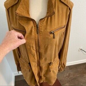 You'll love the suede like material of this MAX JEANS lightweight jean bomber moto biker utility style jacket in beautiful golden tan brown. The soft tencel fabric makes for a luxurious feel. Six pocket design with detailed zippers. Zipper details on sleeves and adjustable cinch waist for flattering and comfortable fit. Perfect for work, date night, casual events, travel, vacation.