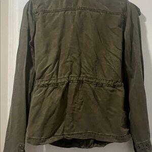 Chic olive utility jacket by Max Jeans. Features multiple pockets and drawstring waist. Ideal for casual outings.
