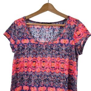 Max Jeans multi-color print scoop neck top size M. Cap shot sleeve, shark bite hem. Good preowned condition. See pics for care tags and approximate measurements.