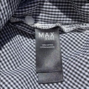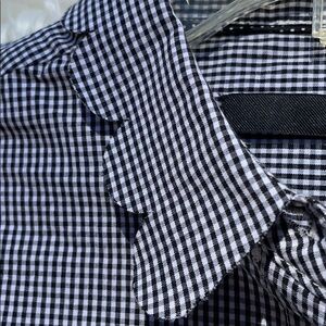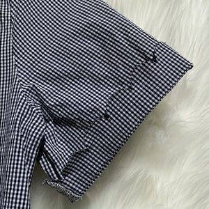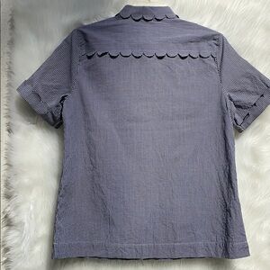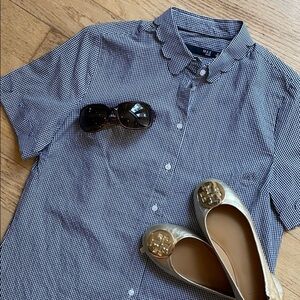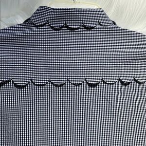 Black and white gingham button-down top has scalloped collar and sleeves. This gives this shirt a flirty look yet is also perfect for the office. Shirt is in excellent condition, no rips, stains, or tears. Listing is for top only.