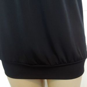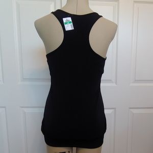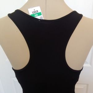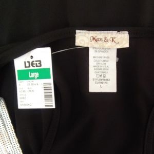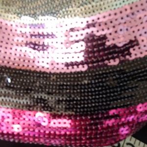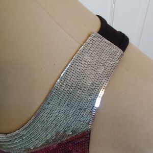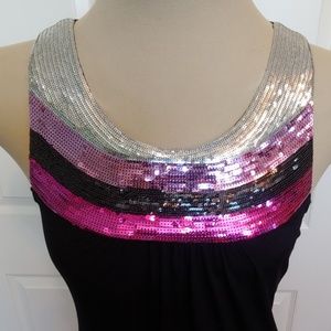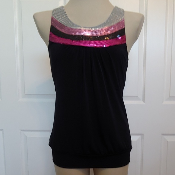 Front yoke is silver, pink, black and magenta sequins (all present!) right to the shoulder. Solid black tank style with 3" stretchy banded bottom. Back is racerback style. 97% Polyester/ 3% Spandex. Machine wash cold