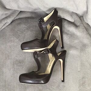 A gorgeous pair of dark chocolate colored shoes. A skinny stiletto heel with a slightly rounded toe. A single strap up the front middle and then adjustable one around the ankle. Made in Italy.