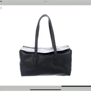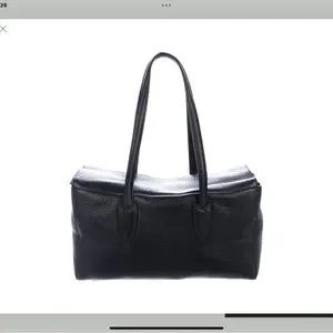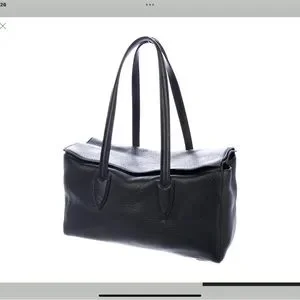 Black leather MaxMara shoulder bag with gold-tone hardware, dual flat shoulder straps, tan suede lining, single detachable zip compartment, and magnetic closures at top.