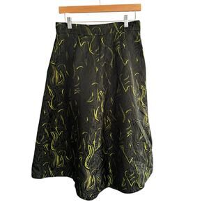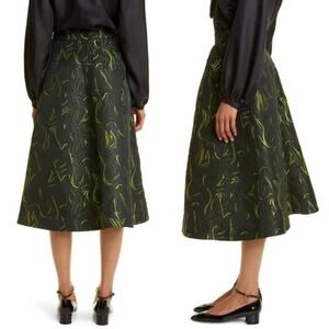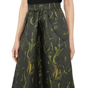 Max Mara Cellula Logo Embroidered Jacquard Skirt in Nero, Black and Green. Size US 12 = IT 46. Features flared cut, voluminous pleating on waistband, closed with invisible zip in side, side flap pockets, unlined, slightly shiny look, smooth feel, and jacquard fabric. 100% polyester. Made in Italy. NWT / New with tags. Retail $725. Rare piece, sold out online!