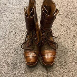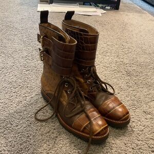 NWOT Max Mara Croc Ostrich Leather Cap Toe Lace Up Combat Dress Boots Booties Shoes Y2K sz 8.5, brown, and camel leather two-tone, amazing textured dress boots with buckle ankle wrap accent. A Vintage look with a modern flare, Perfect for party, casual, work, workwear, business, office, festival, back to school! No box. Will ship right away. Check out my other designer items.