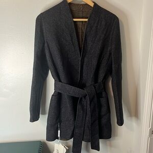 Max Mara Cucito A Mano belted coat in midnight blue chevron with galles pattern inside New with tag Max Mara "Robe Jacket" Reversible Sz: US 12 EU 42 Fabric: 84% virgin wool, 15% cashmere, 1% silk Made in Italy Retail price: $2,190.00 Handmade double face garment - a complex process where two layers of fabric connected by a linking thread which is invisible from the outside. The finished fabric is opened with a special blade which separates the two layers with micrometric precision. The resulting flaps are rolled back between the layers and stitched by hand. Each garment is unique: expert tailors employ an average of 35 to 40 stitches per 10 cm. to obtain the sartorial finish which characterizes hand made double face garments. two large front pockets & two large interior pockets Brand new, with tags condition - no flaws Classic, stylish, and timeless Belt is removable where jacket does not have belt loops to allow for a more versatile look. Made from the highest quality materials, this robe jacket is warm & so very soft Measurements: 22” pit to pit, 31” shoulder to hem, 21” sleeve, 63.5” belt length See photos for details as they are part of the description Any questions please don't hesitate to leave me a comment :)