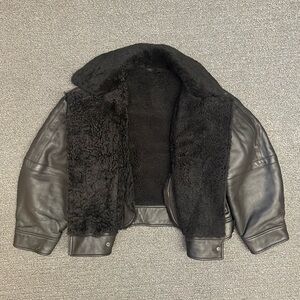 Max Mara Domizia Shearling Moto Jacket in Black - Classic Biker Style - Shearling Lined - Shearling Collar - Asymmetrical Zip (Two Zippers) - Side Pockets - Snap Closure Cuffs - Buckle Detail at Neck & Side of Hems - Seemed Detailing on Sleeves - Boxy Fit / Wider Sleeves - Size US6 - Dust Bag