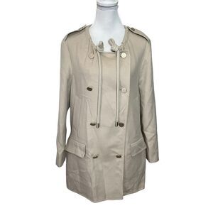 This Max Mara double-breasted blazer in a soft beige hue features chunky tie-style lapels, long sleeves with button accents, and front flap pockets. Made with a premium wool-angora-rabbit blend, this longline silhouette offers elegant structure and timeless sophistication. New without tags; brand label removed to prevent store returns—authenticated via RN number.