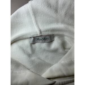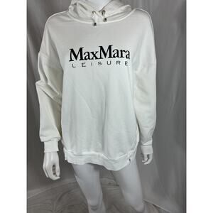Max Mara 'Filo' White Logo Hoodie Size M: loose fit ribbed adjustable drawstring neckline long sleeves chest logo gold finishes, measurements: 23 inch bust x 25 inch length.