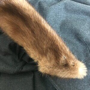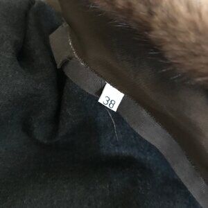 The true color of this fabulous designer piece is a dark gray, almost black. From research on this jacket, i found a few jackets that appear to be the same jacket that state the collar is mink. I am not a fur expert so I can only say it looks like mink to my untrained eyes. There are no tags to show fur, fiber content, or cleaning instructions. There is a tag under the collar that reads 38. It could be an Italian size 38 tag. Standard size charts show measurements indicate a standard size S. Check measurements for fit keeping in mind this is a wrap jacket. See photos for details. Very good pre-owned condition.