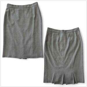 Fully lined with back zip close. Fitted pencil or straight style. Flirty pleated back hem detail. Fabric is a blend of black and cream in a tiny dot tweed look.