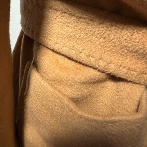 Elegant MaxMara outerwear in tan. Crafted from fine wool, silk and cashmere. Italian design. It great condition with the exception of one thread that holds the belt is not intact.