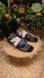 β’Strappy detail at ankle β’Black and white with deep blue accents.