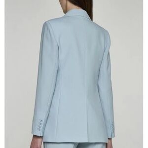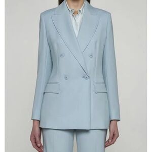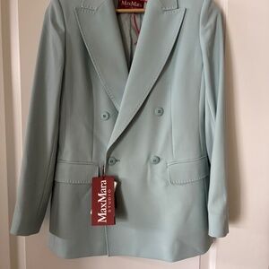 Max Mara Studio's Caucaso double-breasted blazer in aquamarine wool crepe featuring notched lapels, tone-on-tone buttons, front flap pockets and vent at center back. Color: blue