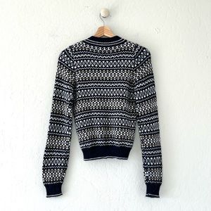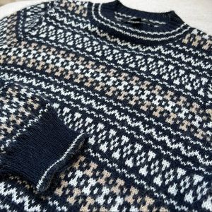Beautiful crew neck sweater with a navy blue-white-tan intarsia knit pattern. Long slim sleeves, cropped length, slightly fuzzy soft yarn. Missing material and size tags, see the measurements: