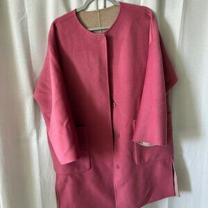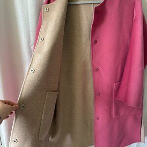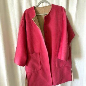 Timeless elegance meets functional design in this Max Mara Weekend reversible coat, crafted from 100% virgin wool. One side is a rich rose-pink; the reverse, a versatile camel beige, giving you two looks in one. Features a minimalist silhouette with a collarless neckline, oversized fit, large patch pockets, and hidden buttons. Excellent used condition.