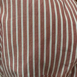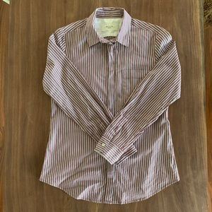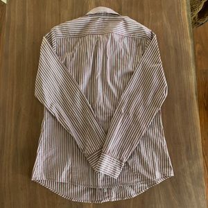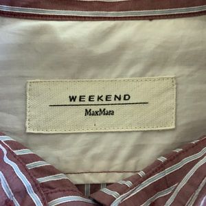 Collared button down shirt from luxury brand Max Mara Weekend. Maroon, white and blue stripes. Size medium, slimmer fit. In excellent condition — no flaws!