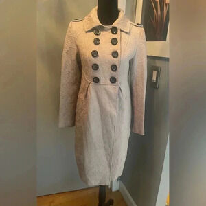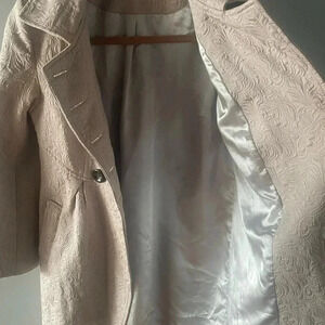Beautiful coat in excellent condition. Features empire waist, double breasted, jacquard floral design. Measures 15 inches pit to pit. Fully lined.