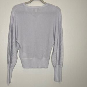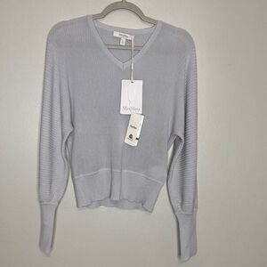 Dramatic bishop sleeves add an elegant touch to this otherwise ultra-cozy V-neck sweater cut from a soft virgin wool ribbed knit.
