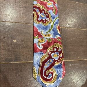 Vibrant tie with a floral pattern in red, blue, and gold.