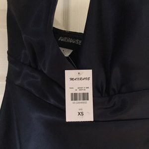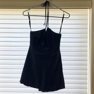 Beautiful and never worn, this sheeny navy blue halter top is perfect for basically any kind of outing. Wear it with a mini skirt for a night out dancing or dress it down with a pair of skinny denims for a daytime date or shopping trip. It features a self-tie halter and empire waistline.
